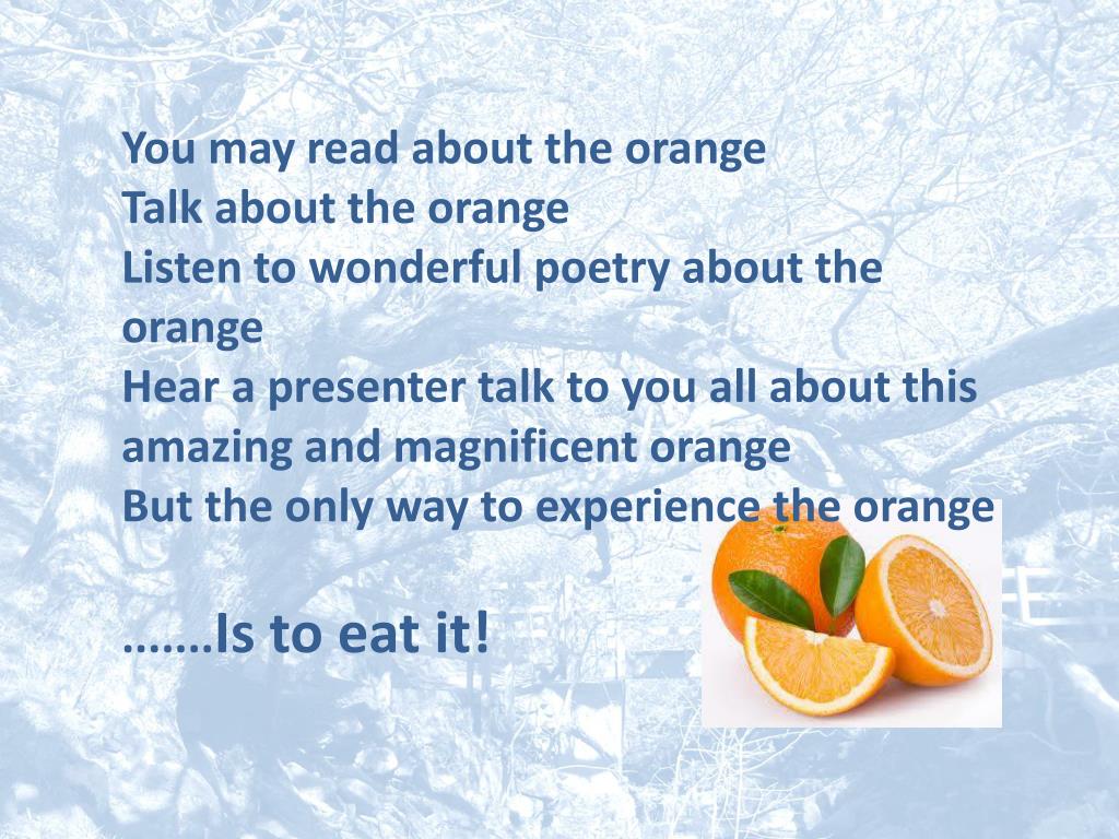 You may read about the orange Talk about the orange Listen to wonderful poetry about the orange Hear a presenter talk to you all about this amazing and magnificent orange But the only way to experience the orange .......Is to eat it!