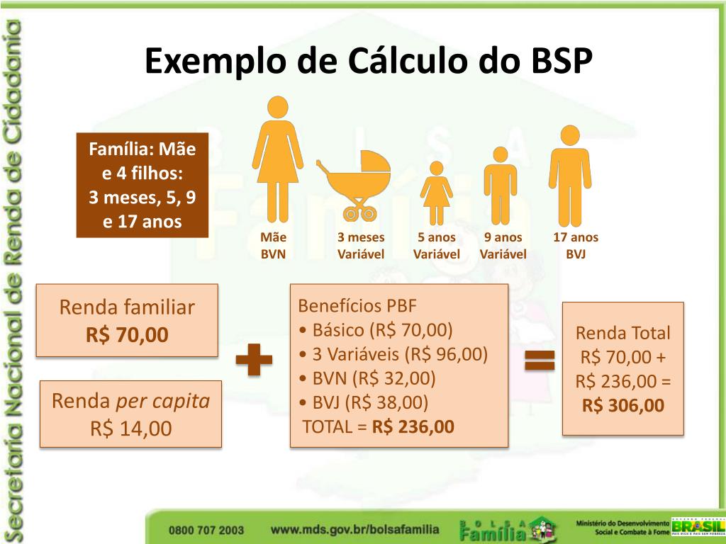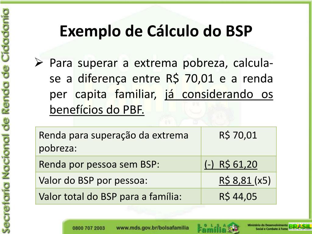 Exemplo de Cálculo do BSP Renda por pessoa da família R$ 70,40