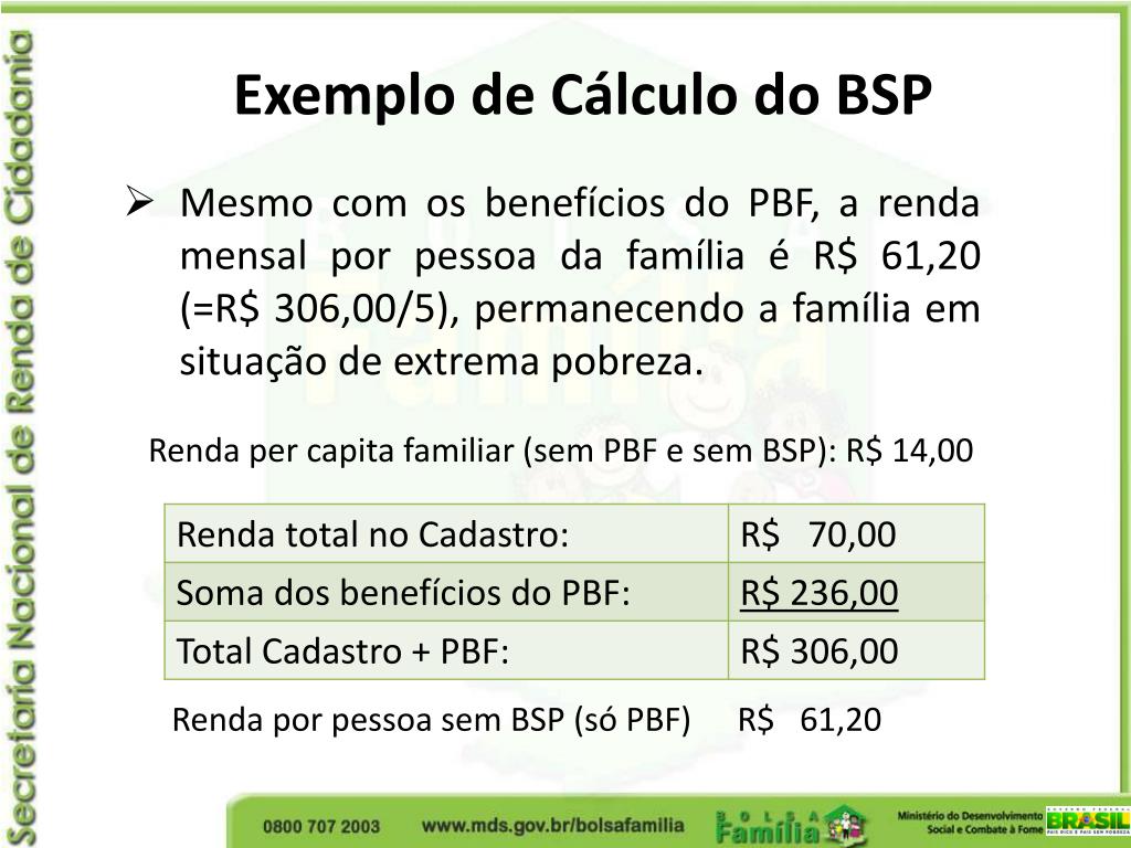 Exemplo de Cálculo do BSP • Mesmo com os benefícios do PBF, a renda mensal por pessoa da família é R$ 61,20 (=R$ 306,00/5), permanecendo a família em situação de extrema pobreza. Renda per capita familiar (sem PBF e sem BSP): R$ 14,00 Renda por pessoa sem BSP (só PBF) R$ 61,20