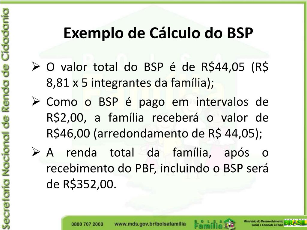 Exemplo de Cálculo do BSP • O valor total do BSP é de R$44,05 (R$ 8,81 x 5 integrantes da família); • Como o BSP é pago em intervalos de R$2,00, a família receberá o valor de R$46,00 (arredondamento de R$ 44,05); • A renda total da família, após o recebimento do PBF, incluindo o BSP será de R$352,00.
