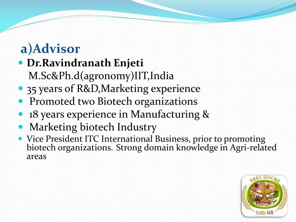 a)Advisor • Dr.RavindranathEnjeti M.Sc&Ph.d(agronomy)IIT,India • 35 years of R&D,Marketing experience • Promoted two Biotech organizations • 18 years experience in Manufacturing & • Marketing biotech Industry • Vice President ITC International Business, prior to promoting biotech organizations.Strong domain knowledge in Agri-related areas