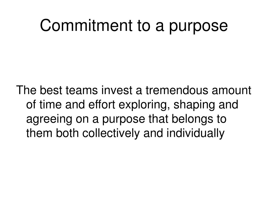 Commitment to a purpose The best teams invest a tremendous amount of time and effort exploring, shaping and agreeing on a purpose that belongs to them both collectively and individually
