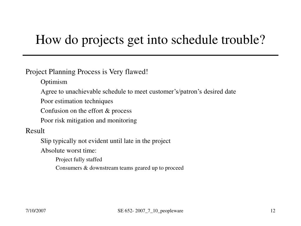 How do projects get into schedule trouble? Project Planning Process is Very flawed! Optimism Agree to unachievable schedule to meet customer’s/patron’s desired date Poor estimation techniques Confusion on the effort & process Poor risk mitigation and monitoring Result Slip typically not evident until late in the project Absolute worst time: Project fully staffed Consumers & downstream teams geared up to proceed SE 652- 2007_7_10_peopleware