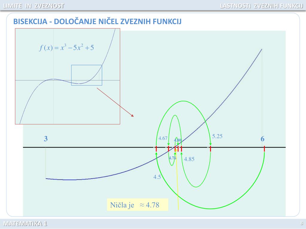 LIMITE IN ZVEZNOST LASTNOSTI ZVEZNIH FUNKCIJ 5.25 3 4.67 6 4.80 4.76 4.85 4.5 BISEKCIJA - DOLOČANJE NIČEL ZVEZNIH FUNKCIJ Ničla je ≈ 4.78 8 MATEMATIKA 1