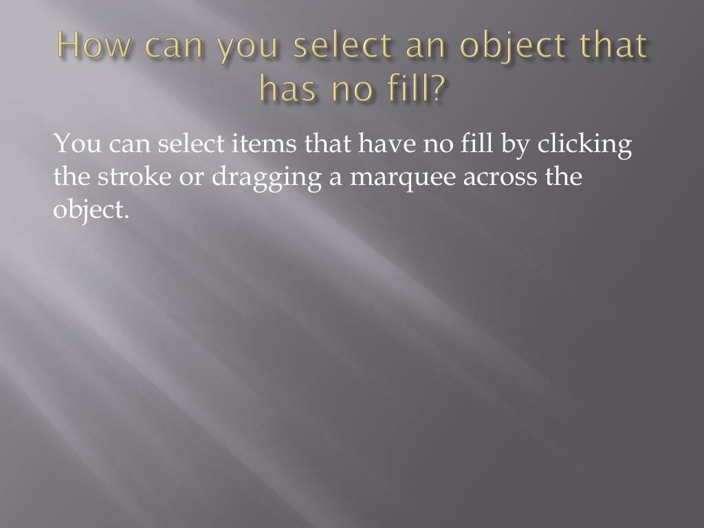 How can you select an object that has no fill? You can select items that have no fill by clicking the stroke or dragging a marquee across the object.