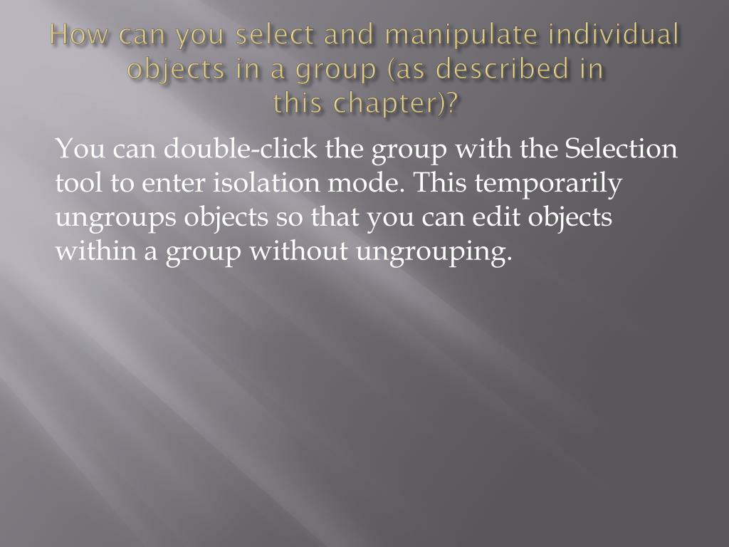 How can you select and manipulate individual objects in a group (as described inthis chapter)? You can double-click the group with the Selection tool to enter isolation mode. This temporarily ungroups objects so that you can edit objects within a group without ungrouping.