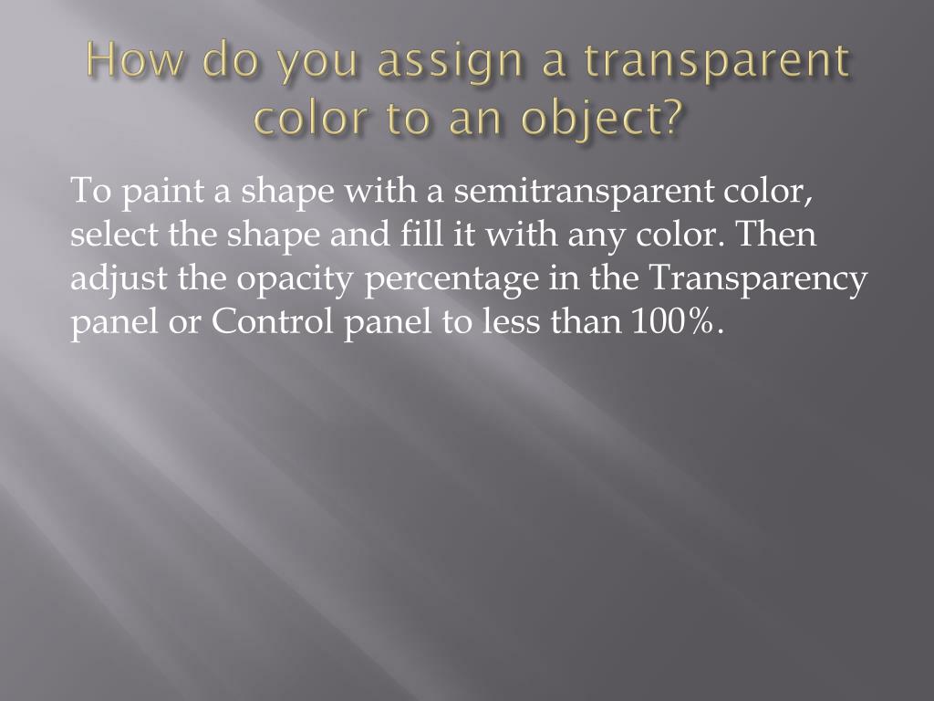How do you assign a transparent color to an object? To paint a shape with a semitransparent color, select the shape and fill it with any color. Then adjust the opacity percentage in the Transparency panel or Control panel to less than 100%.