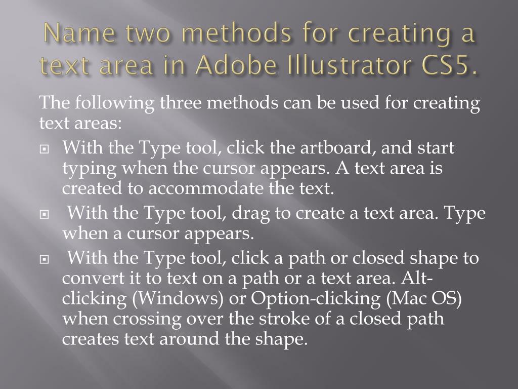 Name two methods for creating a text area in Adobe Illustrator CS5. The following three methods can be used for creating text areas: • With the Type tool, click the artboard, and start typing when the cursor appears. A text area is created to accommodate the text. • With the Type tool, drag to create a text area. Type when a cursor appears. • With the Type tool, click a path or closed shape to convert it to text on a path or a text area. Alt-clicking (Windows) or Option-clicking (Mac OS) when crossing over the stroke of a closed path creates text around the shape.