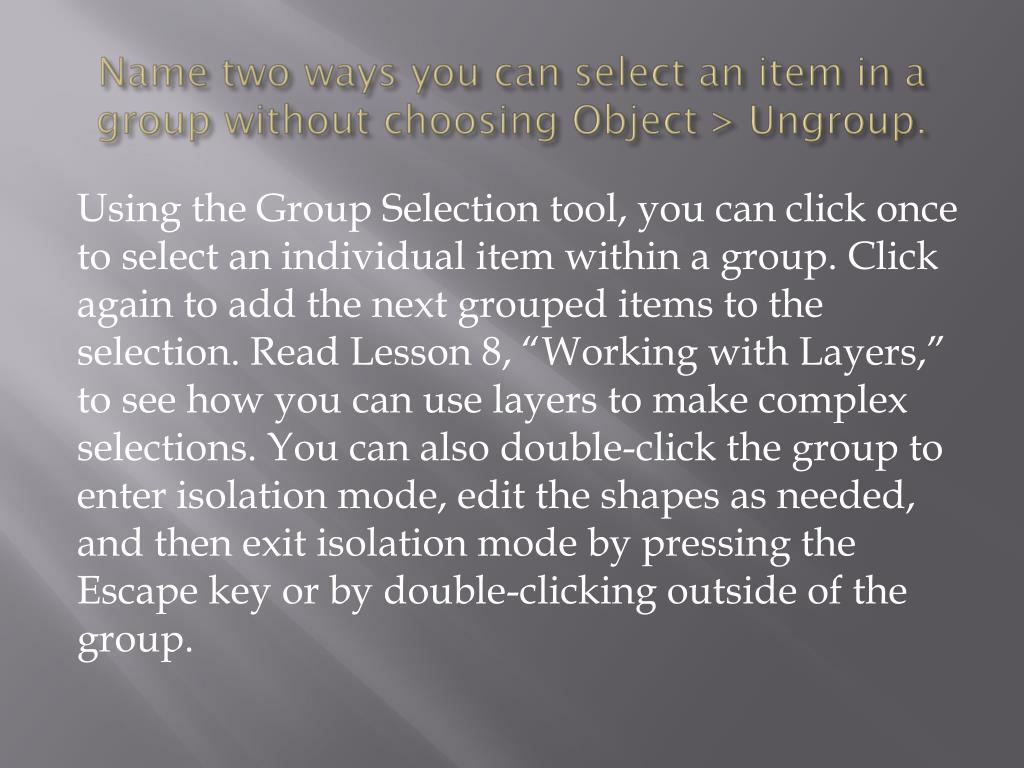 Name two ways you can select an item in a group without choosing Object > Ungroup. Using the Group Selection tool, you can click once to select an individual item within a group. Click again to add the next grouped items to the selection. Read Lesson 8, “Working with Layers,” to see how you can use layers to make complex selections. You can also double-click the group to enter isolation mode, edit the shapes as needed, and then exit isolation mode by pressing the Escape key or by double-clicking outside of the group.