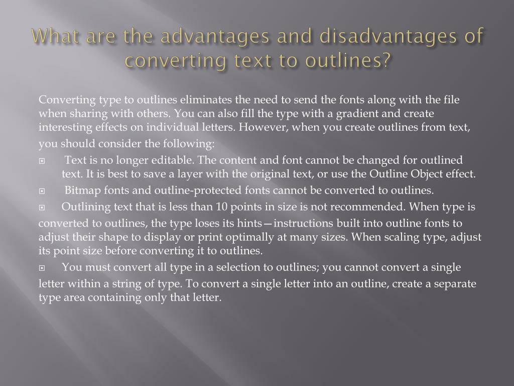 What are the advantages and disadvantages of converting text to outlines? Converting type to outlines eliminates the need to send the fonts along with the file when sharing with others. You can also fill the type with a gradient and create interesting effects on individual letters. However, when you create outlines from text, you should consider the following: • Text is no longer editable. The content and font cannot be changed for outlined text. It is best to save a layer with the original text, or use the Outline Object effect. • Bitmap fonts and outline-protected fonts cannot be converted to outlines. • Outlining text that is less than 10 points in size is not recommended. When type is converted to outlines, the type loses its hints—instructions built into outline fonts to adjust their shape to display or print optimally at many sizes. When scaling type, adjust its point size before converting it to outlines. • You must convert all type in a selection to outlines; you cannot convert a single letter within a string of type. To convert a single letter into an outline, create a separate type area containing only that letter.