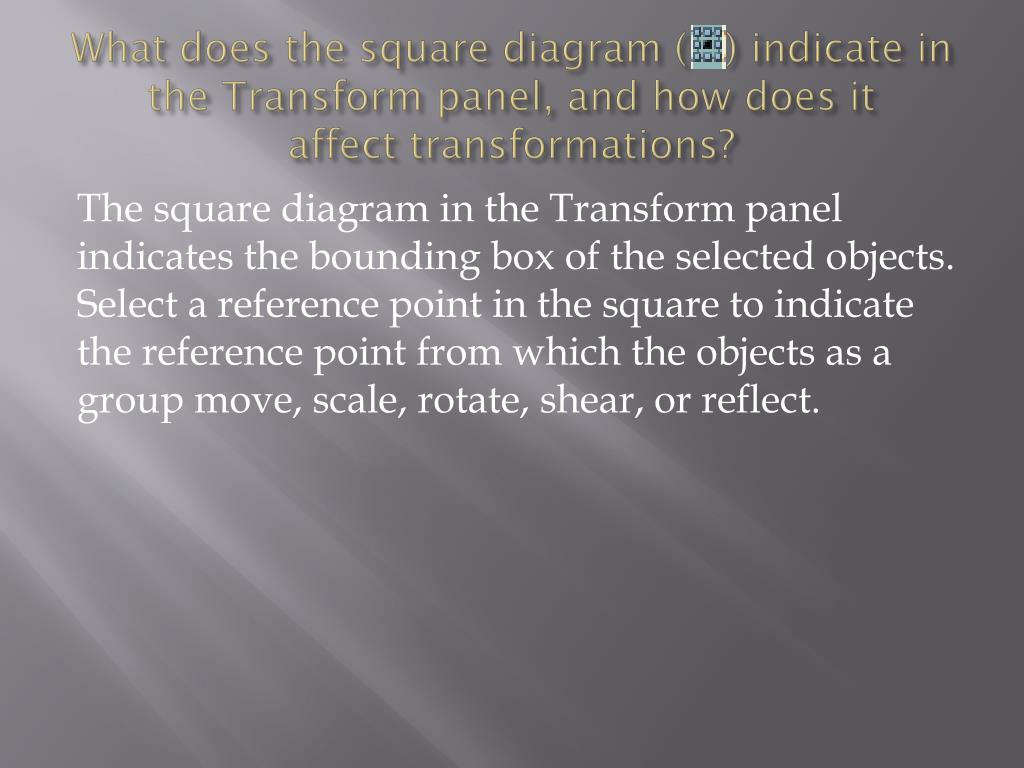 What does the square diagram ( ) indicate in the Transform panel, and how does itaffect transformations? The square diagram in the Transform panel indicates the bounding box of the selected objects. Select a reference point in the square to indicate the reference point from which the objects as a group move, scale, rotate, shear, or reflect.