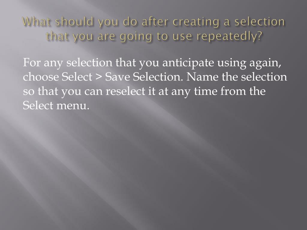 What should you do after creating a selection that you are going to use repeatedly? For any selection that you anticipate using again, choose Select > Save Selection. Name the selection so that you can reselect it at any time from the Select menu.