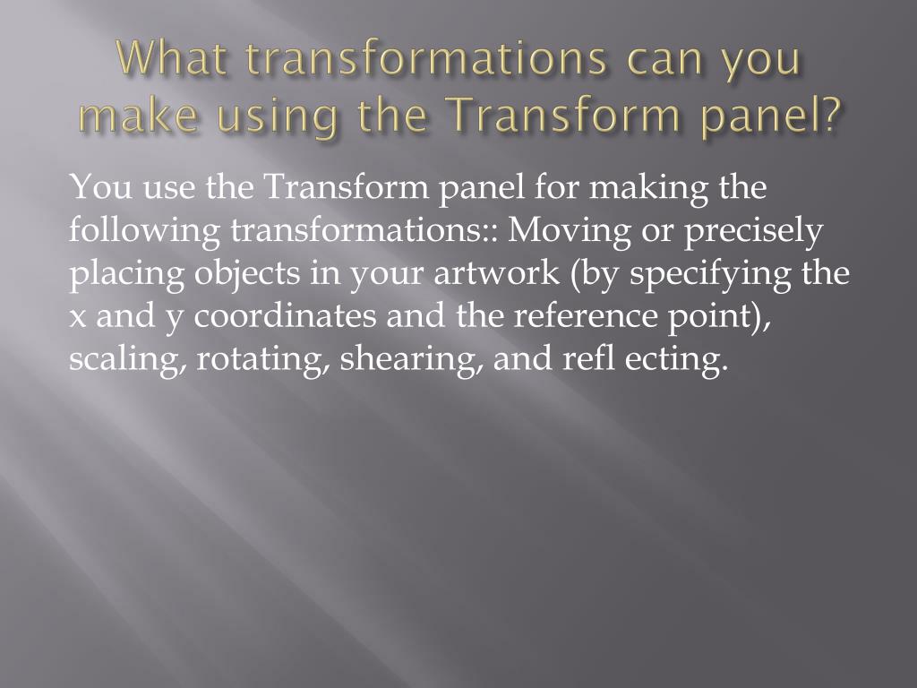 What transformations can you make using the Transform panel? You use the Transform panel for making the following transformations:: Moving or precisely placing objects in your artwork (by specifying the x and y coordinates and the reference point), scaling, rotating, shearing, and reflecting.