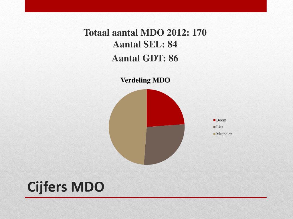 Totaal aantal MDO 2012: 170Aantal SEL: 84 Aantal GDT: 86 Cijfers MDO