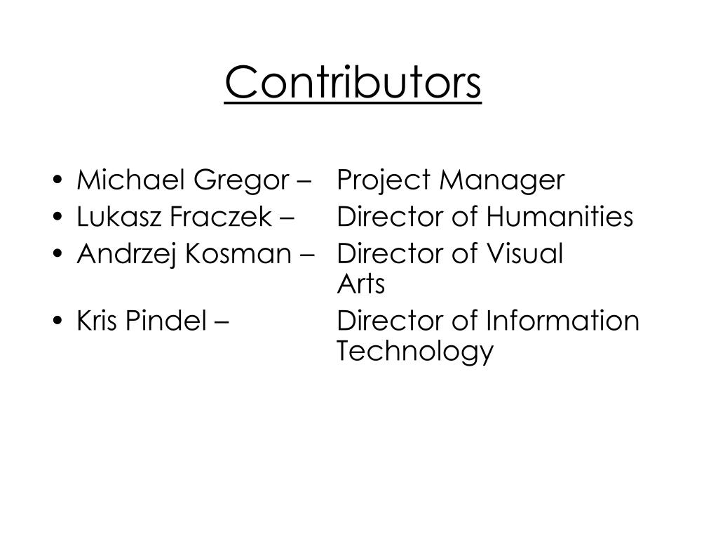 Contributors • Michael Gregor – Project Manager • Lukasz Fraczek – Director of Humanities • Andrzej Kosman – Director of Visual Arts • Kris Pindel – Director of Information Technology