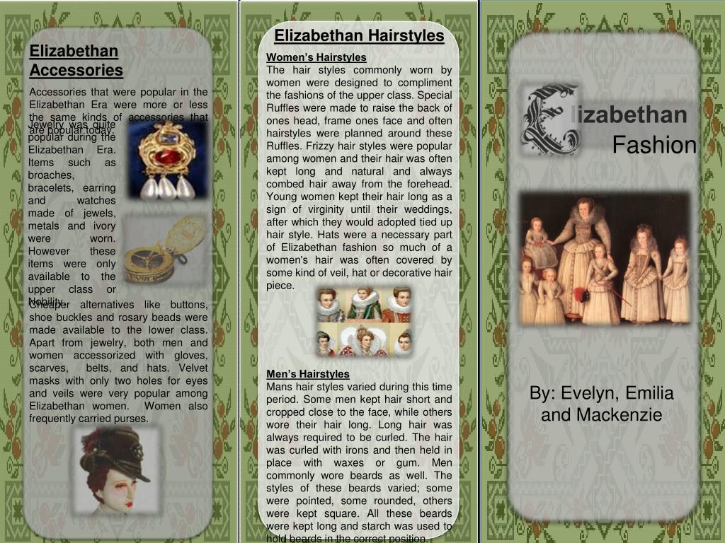 Elizabethan Hairstyles Women’s Hairstyles The hair styles commonly worn by women were designed to compliment the fashions of the upper class. Special Ruffles were made to raise the back of ones head, frame ones face and often hairstyles were planned around these Ruffles. Frizzy hair styles were popular among women and their hair was often kept long and natural and always combed hair away from the forehead. Young women kept their hair long as a sign of virginity until their weddings, after which they would adopted tied up hair style. Hats were a necessary part of Elizabethan fashion so much of a women's hair was often covered by some kind of veil, hat or decorative hair piece. Men’s Hairstyles Mans hair styles varied during this time period. Some men kept hair short and cropped close to the face, while others wore their hair long. Long hair was always required to be curled. The hair was curled with irons and then held in place with waxes or gum. Men commonly wore beards as well. The styles of these beards varied; some were pointed, some rounded, others were kept square. All these beards were kept long and starch was used to hold beards in the correct position. Elizabethan Accessories Accessories that were popular in the Elizabethan Era were more or less the same kinds of accessories that are popular today. lizabethan Jewelry was quite popular during the Elizabethan Era. Items such as broaches, bracelets, earring and watches made of jewels, metals and ivory were worn. However these items were only available to the upper class or Nobility. Fashion Cheaper alternatives like buttons, shoe buckles and rosary beads were made available to the lower class. Apart from jewelry, both men and women accessorized with gloves, scarves, belts, and hats. Velvet masks with only two holes for eyes and veils were very popular among Elizabethan women. Women also frequently carried purses. By: Evelyn, Emilia and Mackenzie