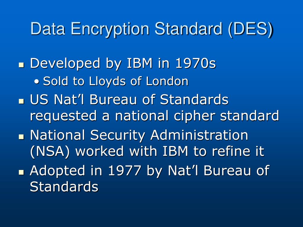 Data Encryption Standard (DES) • Developed by IBM in 1970s • Sold to Lloyds of London • US Nat’l Bureau of Standards requested a national cipher standard • National Security Administration (NSA) worked with IBM to refine it • Adopted in 1977 by Nat’l Bureau of Standards