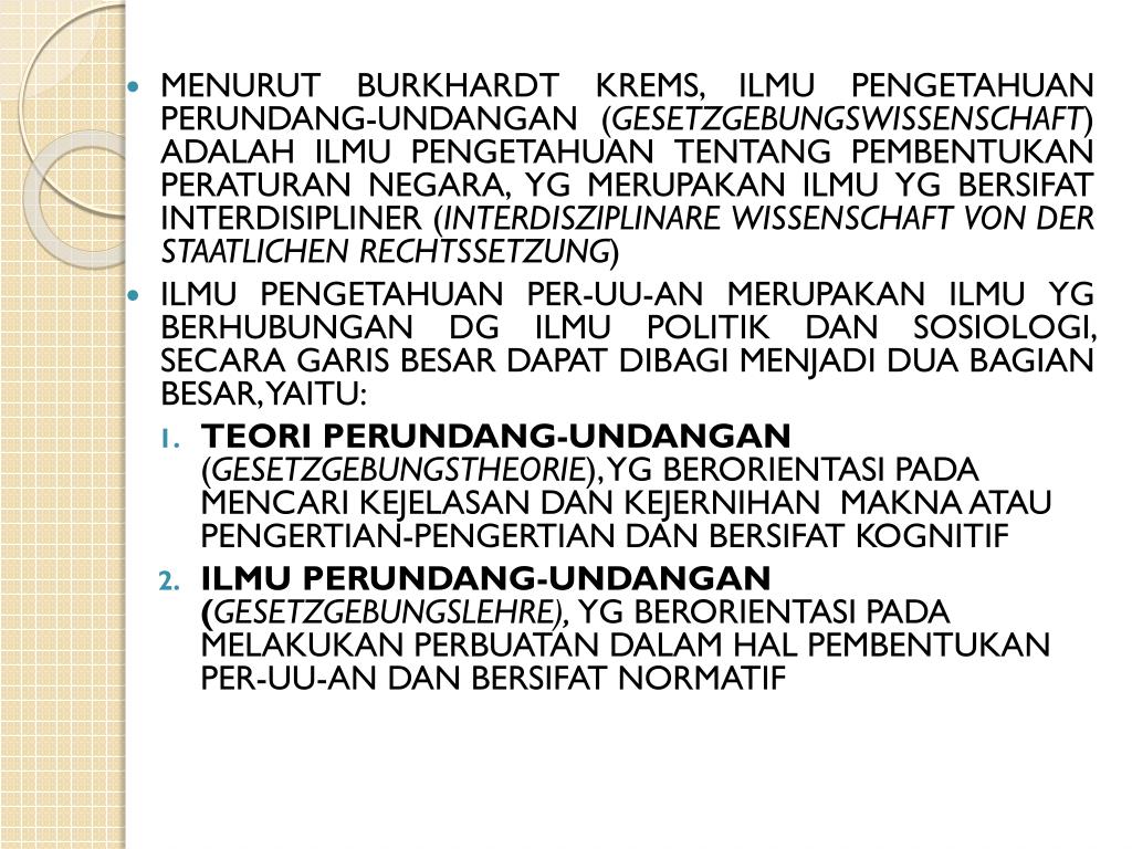 MENURUT BURKHARDT KREMS, ILMU PENGETAHUAN PERUNDANG-UNDANGAN (GESETZGEBUNGSWISSENSCHAFT) ADALAH ILMU PENGETAHUAN TENTANG PEMBENTUKAN PERATURAN NEGARA, YG MERUPAKAN ILMU YG BERSIFAT INTERDISIPLINER (INTERDISZIPLINARE WISSENSCHAFT VON DER STAATLICHEN RECHTSSETZUNG) • ILMU PENGETAHUAN PER-UU-AN MERUPAKAN ILMU YG BERHUBUNGAN DG ILMU POLITIK DAN SOSIOLOGI, SECARA GARIS BESAR DAPAT DIBAGI MENJADI DUA BAGIAN BESAR, YAITU: • TEORI PERUNDANG-UNDANGAN (GESETZGEBUNGSTHEORIE), YG BERORIENTASI PADA MENCARI KEJELASAN DAN KEJERNIHAN MAKNA ATAU PENGERTIAN-PENGERTIAN DAN BERSIFAT KOGNITIF • ILMU PERUNDANG-UNDANGAN (GESETZGEBUNGSLEHRE), YG BERORIENTASI PADA MELAKUKAN PERBUATAN DALAM HAL PEMBENTUKAN PER-UU-AN DAN BERSIFAT NORMATIF