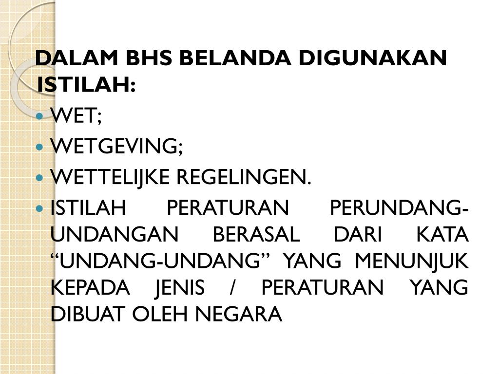 DALAM BHS BELANDA DIGUNAKAN ISTILAH: • WET; • WETGEVING; • WETTELIJKE REGELINGEN. • ISTILAH PERATURAN PERUNDANG-UNDANGAN BERASAL DARI KATA “UNDANG-UNDANG” YANG MENUNJUK KEPADA JENIS / PERATURAN YANG DIBUAT OLEH NEGARA