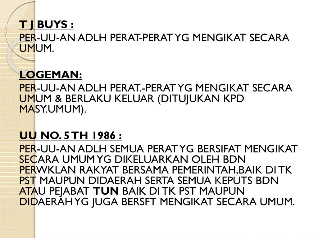 T J BUYS : PER-UU-AN ADLH PERAT-PERAT YG MENGIKAT SECARA UMUM. LOGEMAN: PER-UU-AN ADLH PERAT.-PERAT YG MENGIKAT SECARA UMUM & BERLAKU KELUAR (DITUJUKAN KPD MASY.UMUM). UU NO. 5 TH 1986 : PER-UU-AN ADLH SEMUA PERAT YG BERSIFAT MENGIKAT SECARA UMUM YG DIKELUARKAN OLEH BDN PERWKLAN RAKYAT BERSAMA PEMERINTAH,BAIK DI TK PST MAUPUN DIDAERAH SERTA SEMUA KEPUTS BDN ATAU PEJABAT TUN BAIK DI TK PST MAUPUN DIDAERAH YG JUGA BERSFT MENGIKAT SECARA UMUM.
