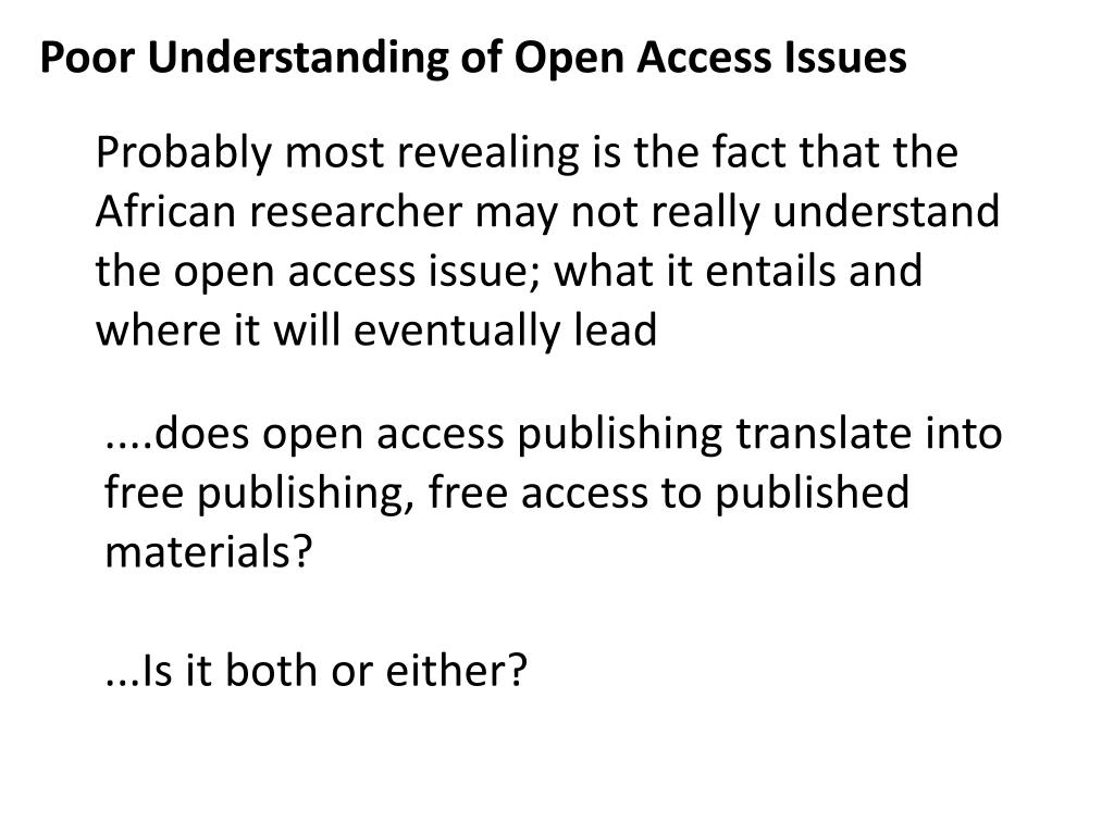 Poor Understanding of Open Access Issues Probably most revealing is the fact that the African researcher may not really understand the open access issue; what it entails and where it will eventually lead ....does open access publishing translate into free publishing, free access to published materials? ...Is it both or either?