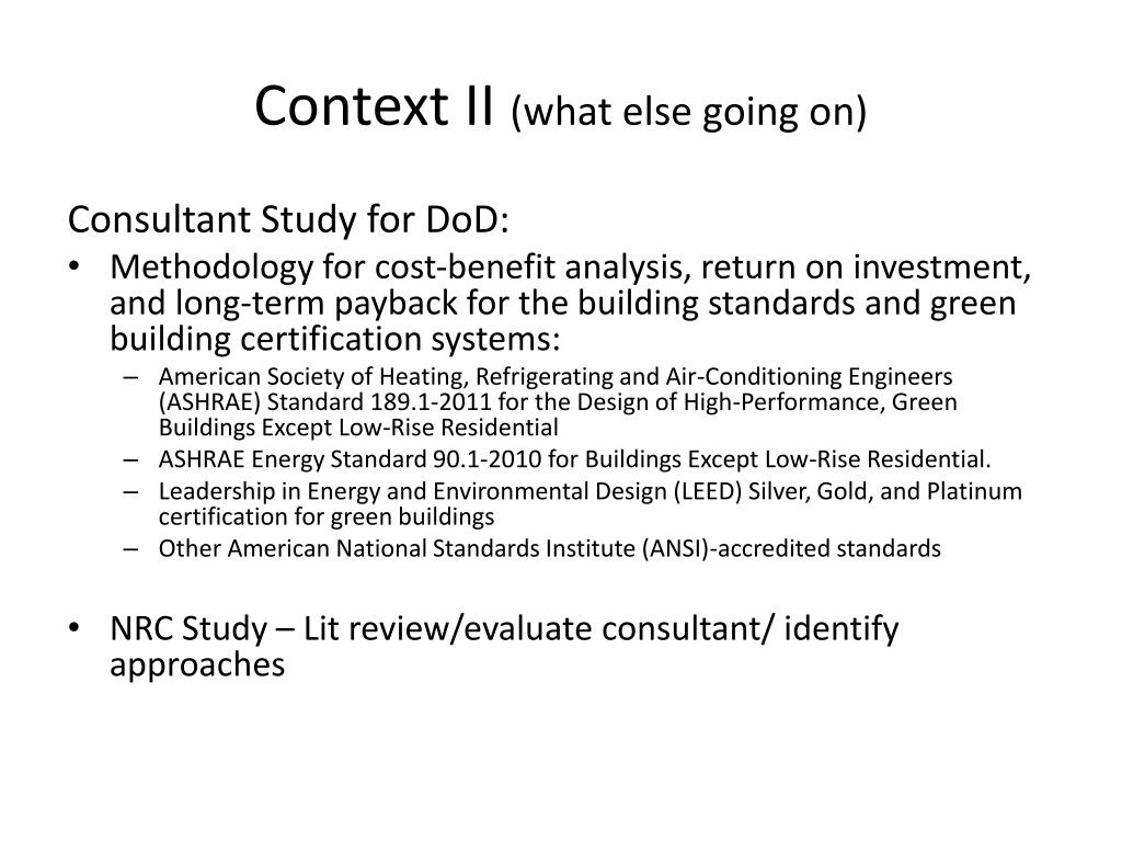 Context II (what else going on) Consultant Study for DoD: • Methodology for cost-benefit analysis, return on investment, and long-term payback for the building standards and green building certification systems: • American Society of Heating, Refrigerating and Air-Conditioning Engineers (ASHRAE) Standard 189.1-2011 for the Design of High-Performance, Green Buildings Except Low-Rise Residential • ASHRAE Energy Standard 90.1-2010 for Buildings Except Low-Rise Residential. • Leadership in Energy and Environmental Design (LEED) Silver, Gold, and Platinum certification for green buildings • Other American National Standards Institute (ANSI)-accredited standards • NRC Study – Lit review/evaluate consultant/ identify approaches