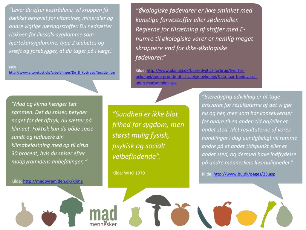 ”Lever du efter kostrådene, vil kroppen få dækket behovet for vitaminer, mineraler og andre vigtige næringsstoffer. Du nedsætter risikoen for livsstils-sygdomme som hjertekarsygdomme, type 2 diabetes og kræft og forebygger, at du tager på i vægt.” Kilde: http://www.altomkost.dk/Anbefalinger/De_8_kostraad/forside.htm ”Økologiske fødevarer er ikke sminket med kunstige farvestoffer eller sødemidler. Reglerne for tilsætning af stoffer med E-numre til økologiske varer er nemlig meget skrappere end for ikke-økologiske fødevarer.” Kilde: http://www.okologi.dk/baeredygtigt-forbrug/hvorfor-oekologi/gode-grunde-til-at-vaelge-oekologi/3-du-faar-foedevarer-uden-madsminke.aspx ”Bæredygtig udvikling er at tage ansvaret for resultaterne af det vi gør nu og her, men som har konsekvenser for andre til en anden tid og/eller et andet sted. Idet resultaterne af vores handlinger i dag uundgåeligt vil ramme andre på et andet tidspunkt eller et andet sted, og dermed have indflydelse på andre menneskers livsmuligheder.” Kilde: http://www.bu.dk/pages/23.asp ”Mad og klima hænger tæt sammen. Det du spiser, betyder noget for det aftryk, du sætter på klimaet. Faktisk kan du både spise sundt og reducere din klimabelastning med op til cirka 30 procent, hvis du spiser efter madpyramidens anbefalinger. ” Kilde: http://madpyramiden.dk/klima ”Sundhed er ikke blot frihed for sygdom, men størst mulig fysisk, psykisk og socialt velbefindende”. Kilde: WHO 1970