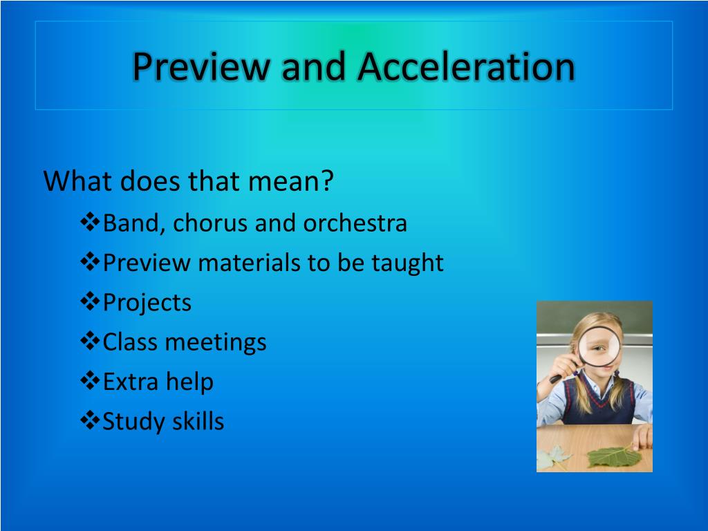 Preview and Acceleration What does that mean? • Band, chorus and orchestra • Preview materials to be taught • Projects • Class meetings • Extra help • Study skills