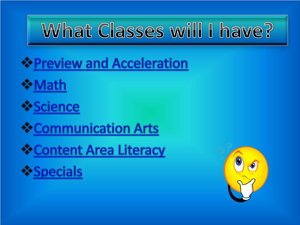 What Classes will I have? • Preview and Acceleration • Math • Science • Communication Arts • Content Area Literacy • Specials