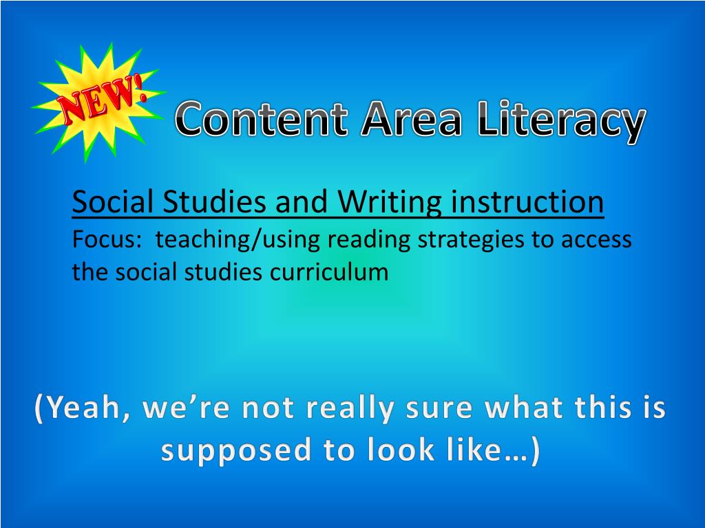 Content Area Literacy Social Studies and Writing instruction Focus: teaching/using reading strategies to access the social studies curriculum (Yeah, we’re not really sure what this is supposed to look like…)