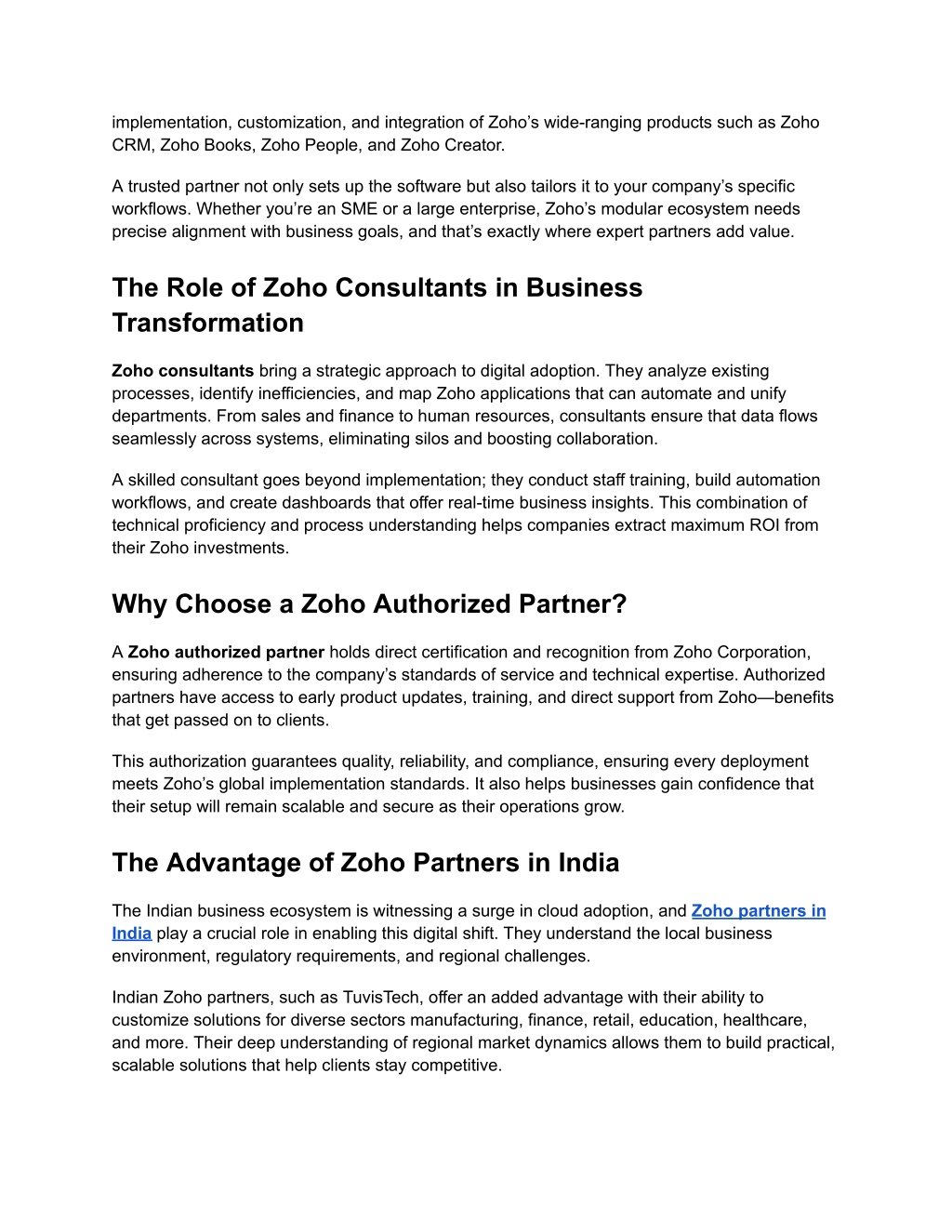 implementation, customization, and integration of Zoho’s wide-ranging products such as Zoho CRM, Zoho Books, Zoho People, and Zoho Creator. A trusted partner not only sets up the software but also tailors it to your company’s specific workflows. Whether you’re an SME or a large enterprise, Zoho’s modular ecosystem needs precise alignment with business goals, and that’s exactly where expert partners add value. The Role of Zoho Consultants in Business Transformation Zoho consultants bring a strategic approach to digital adoption. They analyze existing processes, identify inefficiencies, and map Zoho applications that can automate and unify departments. From sales and finance to human resources, consultants ensure that data flows seamlessly across systems, eliminating silos and boosting collaboration. A skilled consultant goes beyond implementation; they conduct staff training, build automation workflows, and create dashboards that offer real-time business insights. This combination of technical proficiency and process understanding helps companies extract maximum ROI from their Zoho investments. Why Choose a Zoho Authorized Partner? A Zoho authorized partner holds direct certification and recognition from Zoho Corporation, ensuring adherence to the company’s standards of service and technical expertise. Authorized partners have access to early product updates, training, and direct support from Zoho—benefits that get passed on to clients. This authorization guarantees quality, reliability, and compliance, ensuring every deployment meets Zoho’s global implementation standards. It also helps businesses gain confidence that their setup will remain scalable and secure as their operations grow. The Advantage of Zoho Partners in India The Indian business ecosystem is witnessing a surge in cloud adoption, and Zoho partners in India play a crucial role in enabling this digital shift. They understand the local business environment, regulatory requirements, and regional challenges. Indian Zoho partners, such as TuvisTech, offer an added advantage with their ability to customize solutions for diverse sectors manufacturing, finance, retail, education, healthcare, and more. Their deep understanding of regional market dynamics allows them to build practical, scalable solutions that help clients stay competitive.
