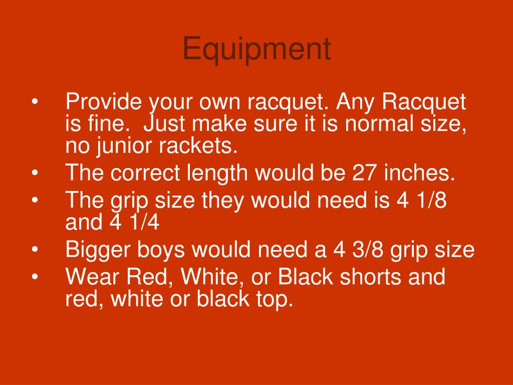 Equipment • Provide your own racquet. Any Racquet is fine. Just make sure it is normal size, no junior rackets. • The correct length would be 27 inches. • The grip size they would need is 4 1/8 and 4 1/4 • Bigger boys would need a 4 3/8 grip size • Wear Red, White, or Black shorts and red, white or black top.