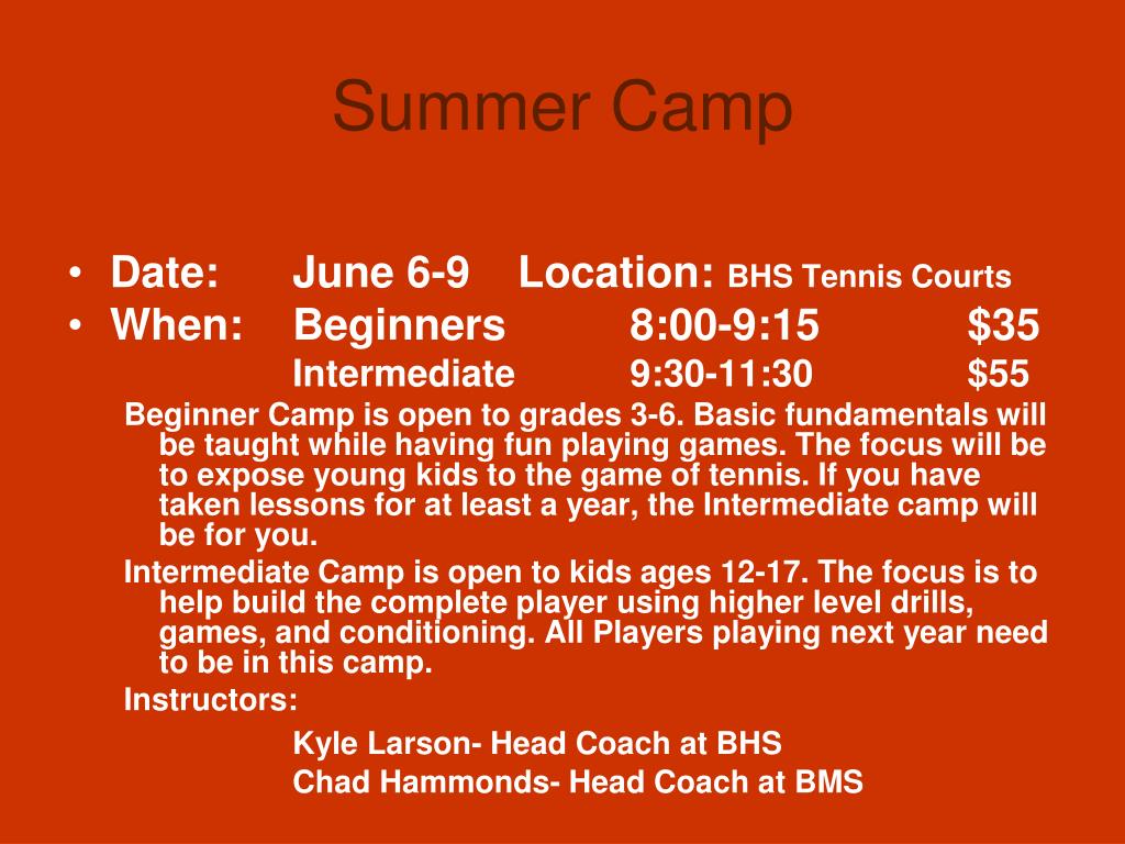 Summer Camp • Date: June 6-9 Location: BHS Tennis Courts • When: Beginners 8:00-9:15 $35 Intermediate 9:30-11:30 $55 Beginner Camp is open to grades 3-6. Basic fundamentals will be taught while having fun playing games. The focus will be to expose young kids to the game of tennis. If you have taken lessons for at least a year, the Intermediate camp will be for you. Intermediate Camp is open to kids ages 12-17. The focus is to help build the complete player using higher level drills, games, and conditioning. All Players playing next year need to be in this camp. Instructors: Kyle Larson- Head Coach at BHS Chad Hammonds- Head Coach at BMS