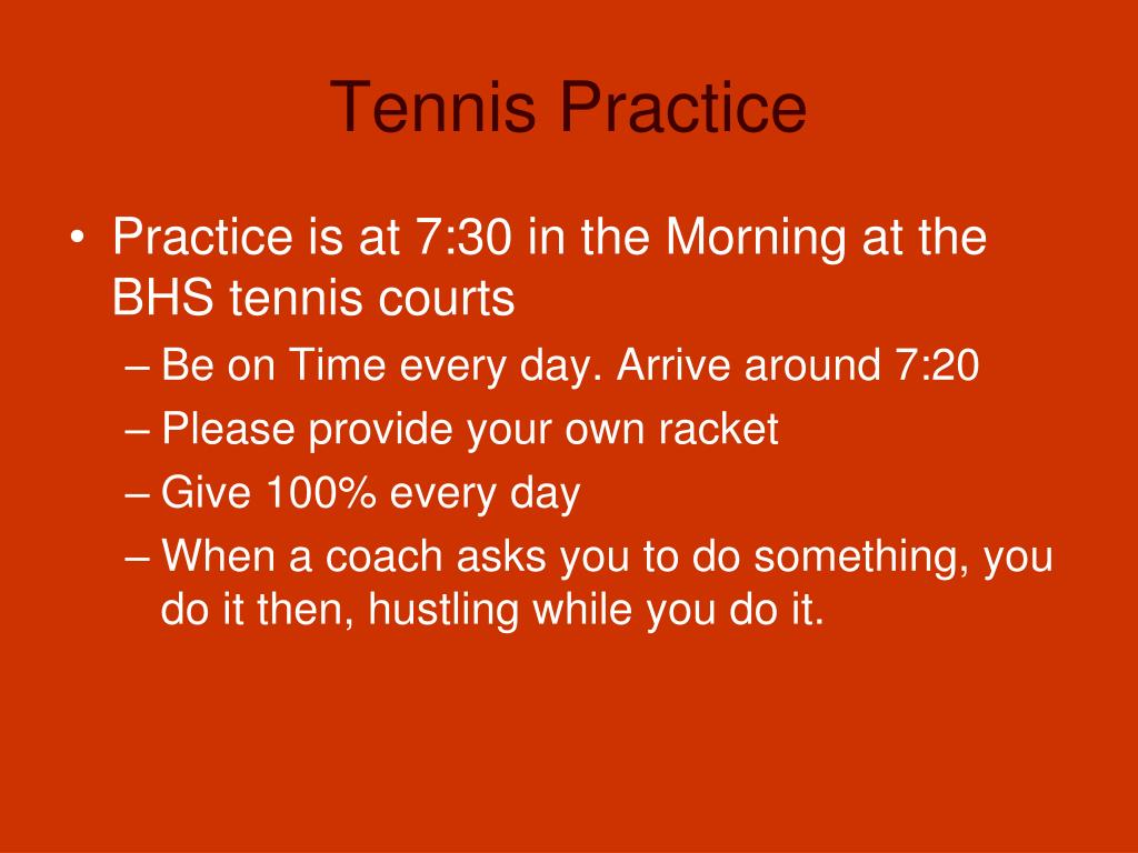 Tennis Practice • Practice is at 7:30 in the Morning at the BHS tennis courts • Be on Time every day. Arrive around 7:20 • Please provide your own racket • Give 100% every day • When a coach asks you to do something, you do it then, hustling while you do it.