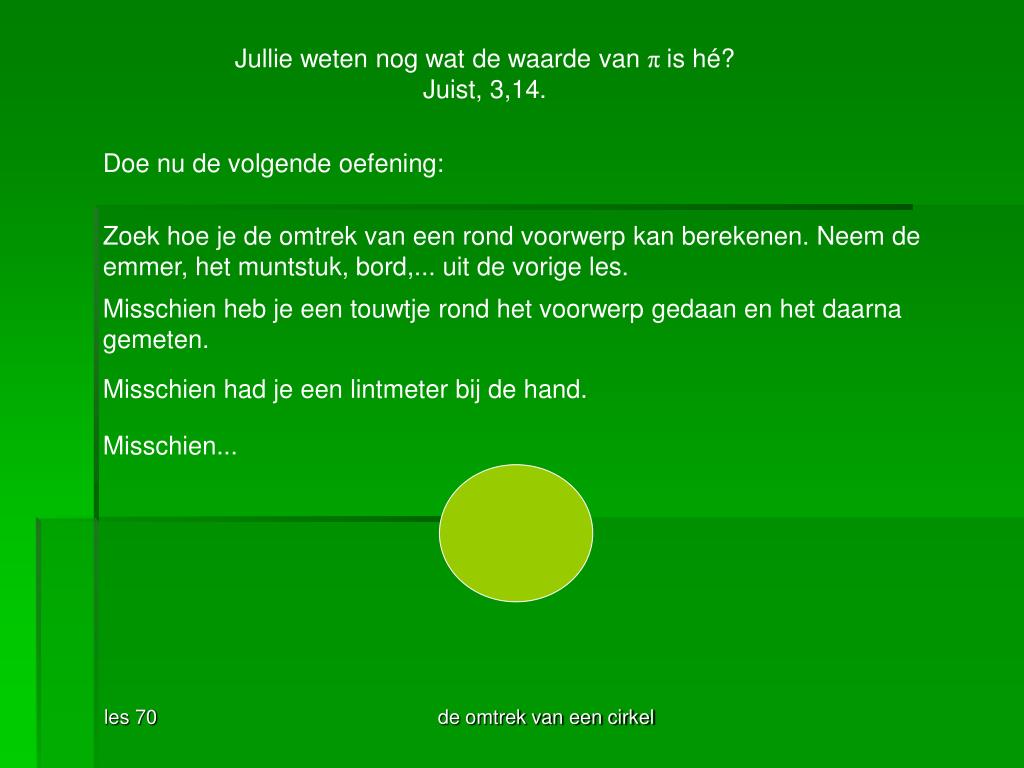 Les 70. De omtrek van een cirkel. Jullie weten nog wat de waarde van π is hé? Juist, 3,14. Doe nu de volgende oefening:. Zoek hoe je de omtrek van een rond voorwerp kan berekenen. Neem de emmer, het muntstuk, bord,... uit de vorige les.