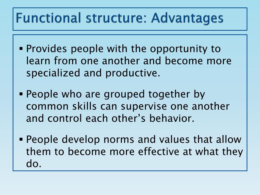 Functional structure: Advantages Provides people with the opportunity to learn from one another and become more specialized and productive. People who are grouped together by common skills can supervise one another and control each other’s behavior. People develop norms and values that allow them to become more effective at what they do.
