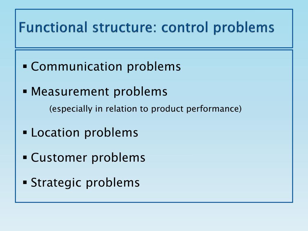 Functional structure: control problems Communication problems Measurement problems (especially in relation to product performance) Location problems Customer problems Strategic problems