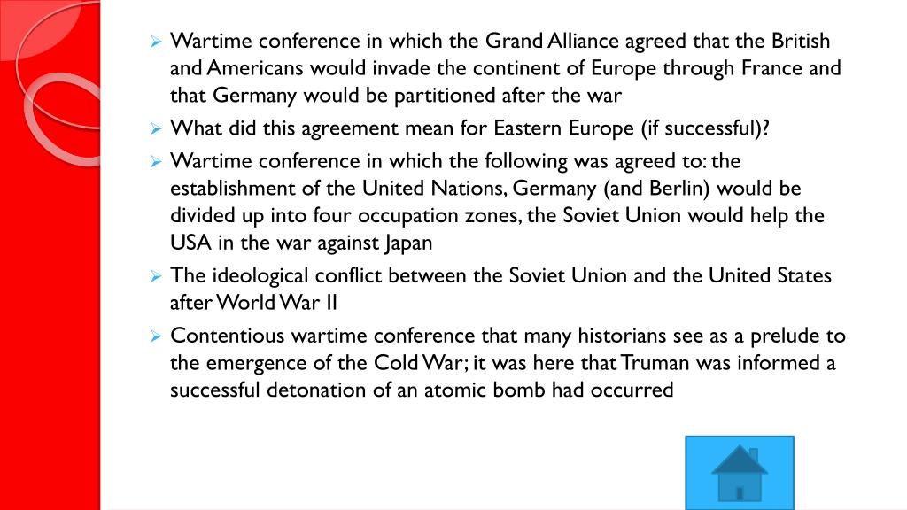 Wartime conference in which the Grand Alliance agreed that the British and Americans would invade the continent of Europe through France and that Germany would be partitioned after the war • What did this agreement mean for Eastern Europe (if successful)? • Wartime conference in which the following was agreed to: the establishment of the United Nations, Germany (and Berlin) would be divided up into four occupation zones, the Soviet Union would help the USA in the war against Japan • The ideological conflict between the Soviet Union and the United States after World War II • Contentious wartime conference that many historians see as a prelude to the emergence of the Cold War; it was here that Truman was informed a successful detonation of an atomic bomb had occurred