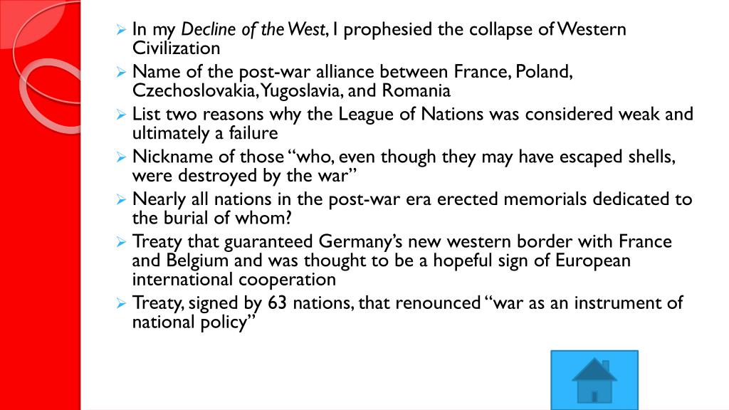 In my Decline of the West, I prophesied the collapse of Western Civilization • Name of the post-war alliance between France, Poland, Czechoslovakia, Yugoslavia, and Romania • List two reasons why the League of Nations was considered weak and ultimately a failure • Nickname of those “who, even though they may have escaped shells, were destroyed by the war” • Nearly all nations in the post-war era erected memorials dedicated to the burial of whom? • Treaty that guaranteed Germany’s new western border with France and Belgium and was thought to be a hopeful sign of European international cooperation • Treaty, signed by 63 nations, that renounced “war as an instrument of national policy”