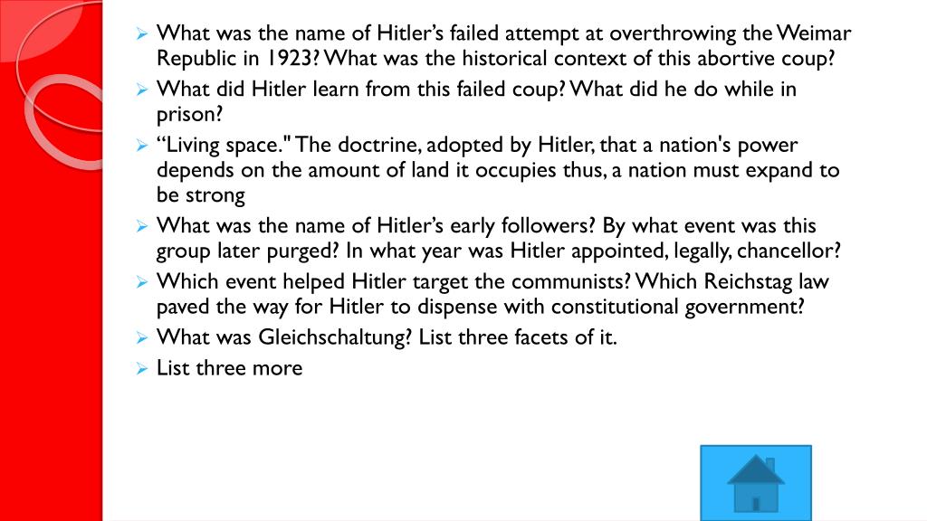 What was the name of Hitler’s failed attempt at overthrowing the Weimar Republic in 1923? What was the historical context of this abortive coup? • What did Hitler learn from this failed coup? What did he do while in prison? • “Living space." The doctrine, adopted by Hitler, that a nation's power depends on the amount of land it occupies thus, a nation must expand to be strong • What was the name of Hitler’s early followers? By what event was this group later purged? In what year was Hitler appointed, legally, chancellor? • Which event helped Hitler target the communists? Which Reichstag law paved the way for Hitler to dispense with constitutional government? • What was Gleichschaltung? List three facets of it. • List three more