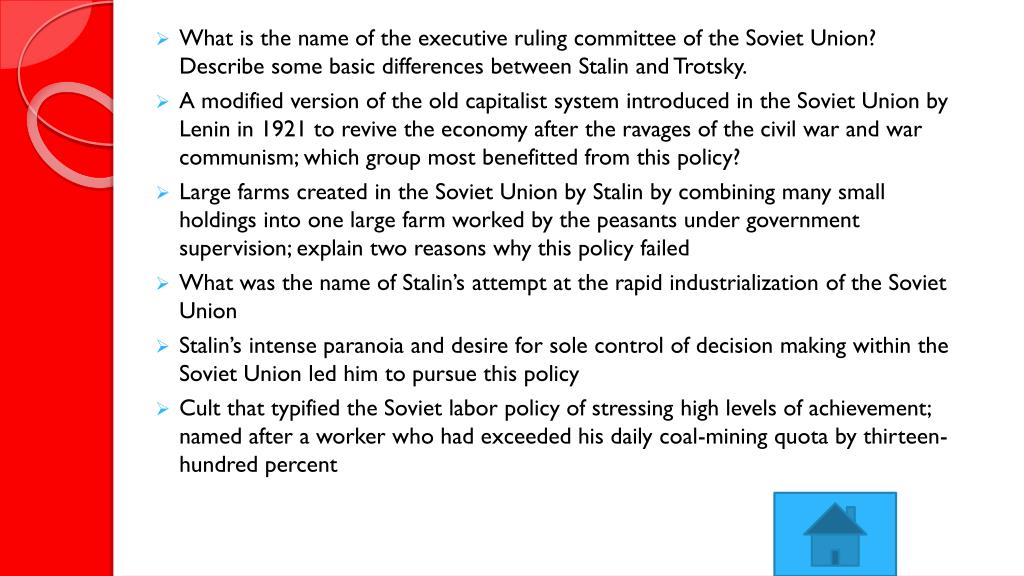 What is the name of the executive ruling committee of the Soviet Union? Describe some basic differences between Stalin and Trotsky. • A modified version of the old capitalist system introduced in the Soviet Union by Lenin in 1921 to revive the economy after the ravages of the civil war and war communism; which group most benefitted from this policy? • Large farms created in the Soviet Union by Stalin by combining many small holdings into one large farm worked by the peasants under government supervision; explain two reasons why this policy failed • What was the name of Stalin’s attempt at the rapid industrialization of the Soviet Union • Stalin’s intense paranoia and desire for sole control of decision making within the Soviet Union led him to pursue this policy • Cult that typified the Soviet labor policy of stressing high levels of achievement; named after a worker who had exceeded his daily coal-mining quota by thirteen-hundred percent