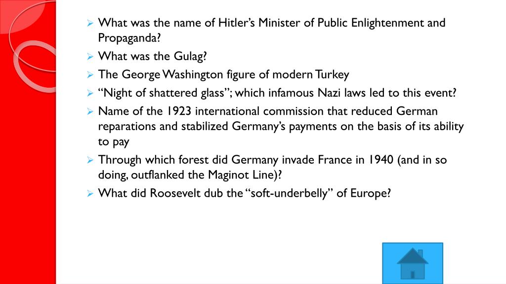 What was the name of Hitler’s Minister of Public Enlightenment and Propaganda? • What was the Gulag? • The George Washington figure of modern Turkey • “Night of shattered glass”; which infamous Nazi laws led to this event? • Name of the 1923 international commission that reduced German reparations and stabilized Germany’s payments on the basis of its ability to pay • Through which forest did Germany invade France in 1940 (and in so doing, outflanked the Maginot Line)? • What did Roosevelt dub the “soft-underbelly” of Europe?