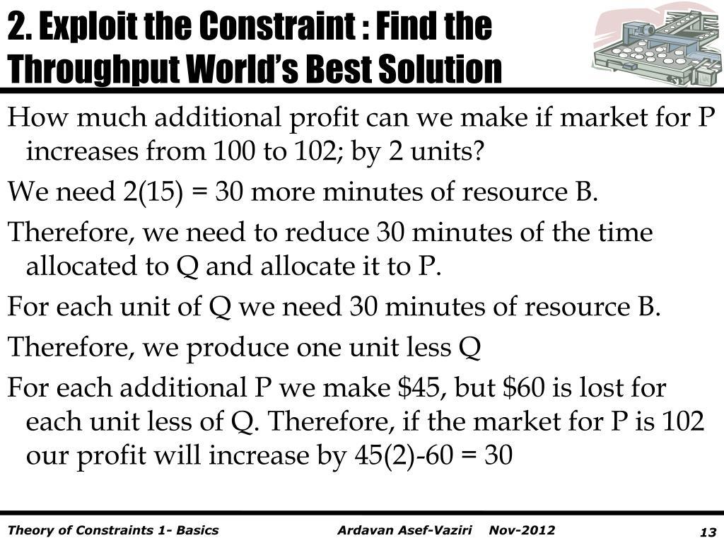 2. Exploit the Constraint : Find the Throughput World’s Best Solution How much additional profit can we make if market for P increases from 100 to 102; by 2 units? We need 2(15) = 30 more minutes of resource B. Therefore, we need to reduce 30 minutes of the time allocated to Q and allocate it to P. For each unit of Q we need 30 minutes of resource B. Therefore, we produce one unit less Q For each additional P we make $45, but $60 is lost for each unit less of Q. Therefore, if the market for P is 102 our profit will increase by 45(2)-60 = 30