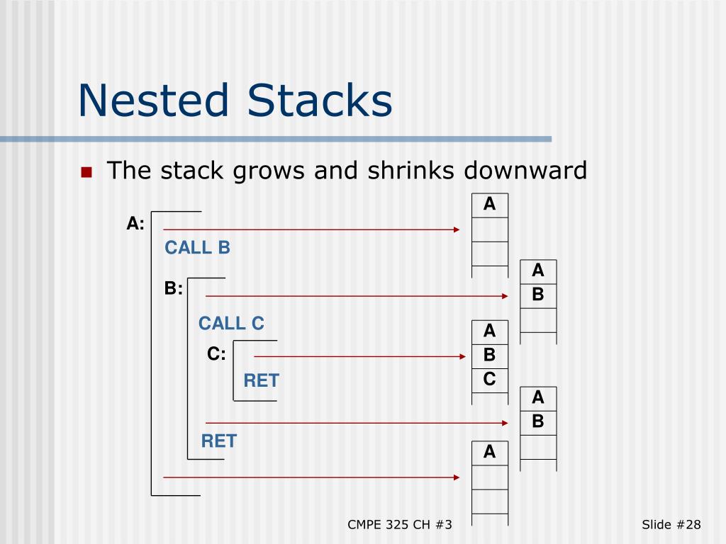 A A: CALL B A B: B CALL C A C: B RET C A B RET A Nested Stacks • The stack grows and shrinks downward CMPE 325CH #3