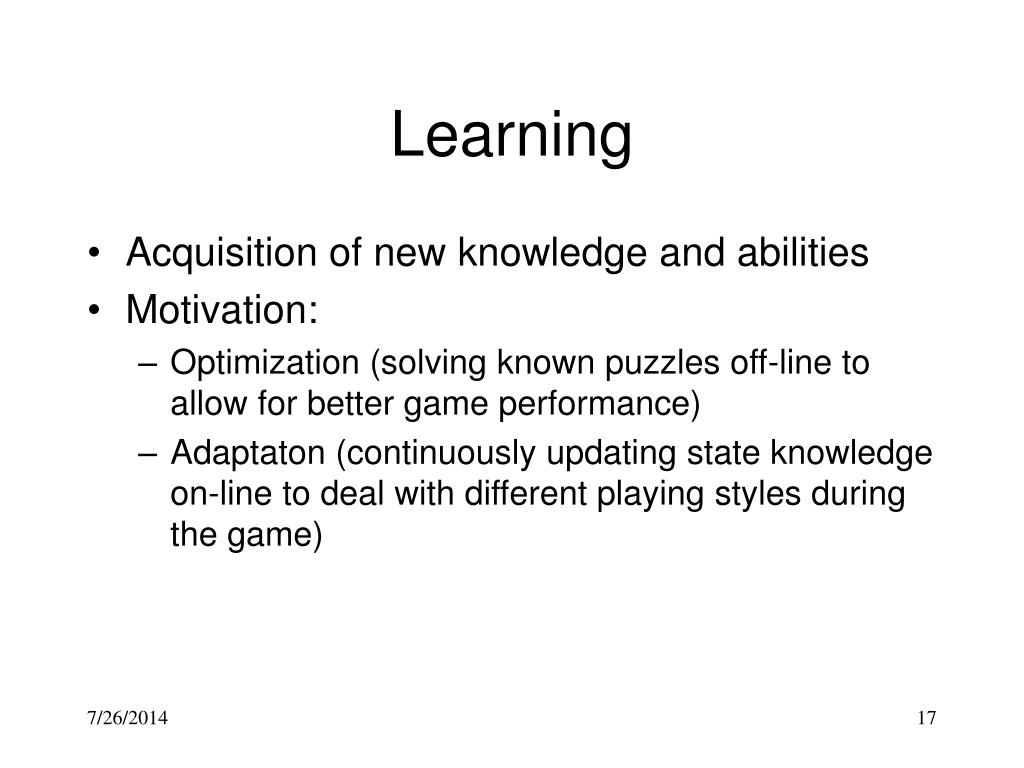 Learning • Acquisition of new knowledge and abilities • Motivation: • Optimization (solving known puzzles off-line to allow for better game performance) • Adaptaton (continuously updating state knowledge on-line to deal with different playing styles during the game)