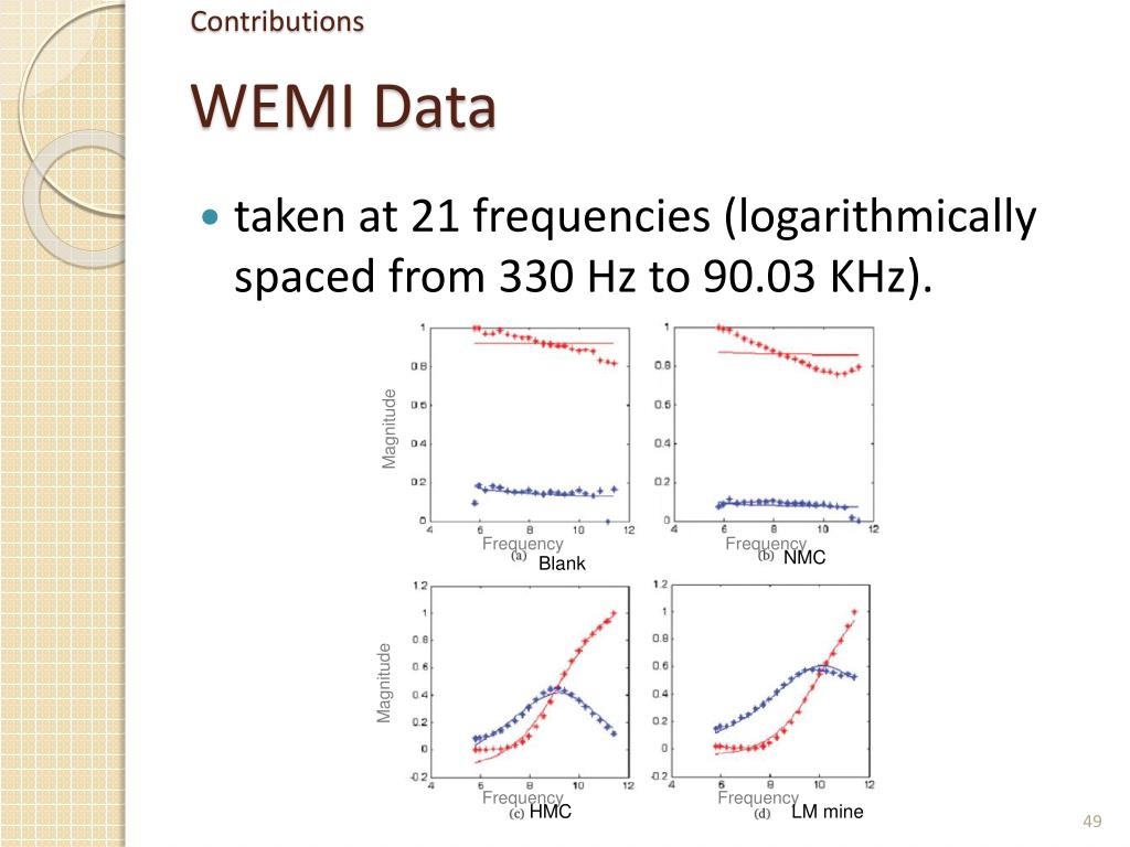 WEMI Data • taken at 21 frequencies (logarithmically spaced from 330 Hz to 90.03 KHz). Magnitude Frequency Frequency NMC Blank Magnitude Frequency Frequency HMC LM mine
