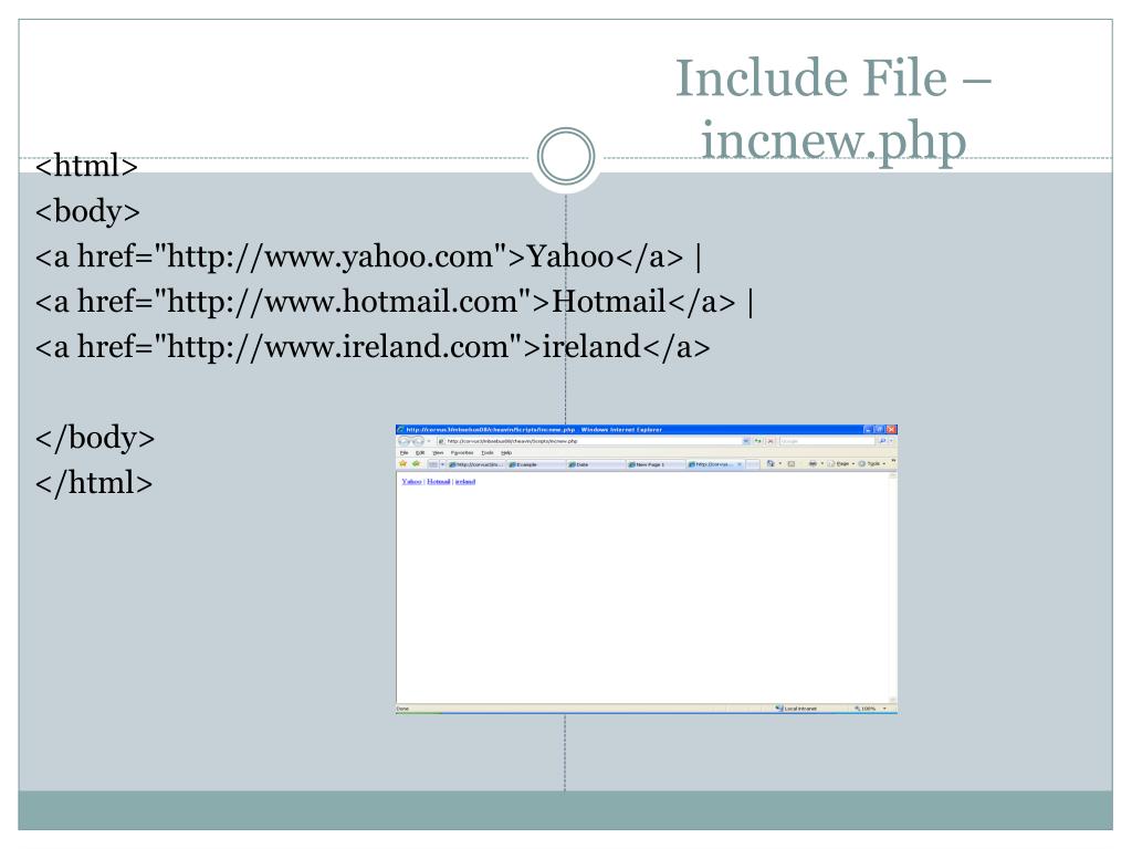 Include File – incnew.php <html> <body> <a href="http://www.yahoo.com">Yahoo</a> | <a href="http://www.hotmail.com">Hotmail</a> | <a href="http://www.ireland.com">ireland</a> </body> </html>
