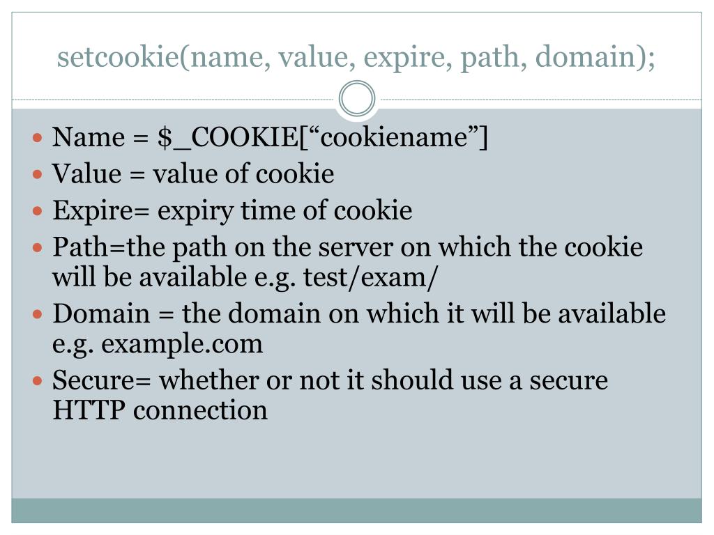 setcookie(name, value, expire, path, domain); Name = $_COOKIE[“cookiename”] Value = value of cookie Expire= expiry time of cookie Path=the path on the server on which the cookie will be available e.g. test/exam/ Domain = the domain on which it will be available e.g. example.com Secure= whether or not it should use a secure HTTP connection