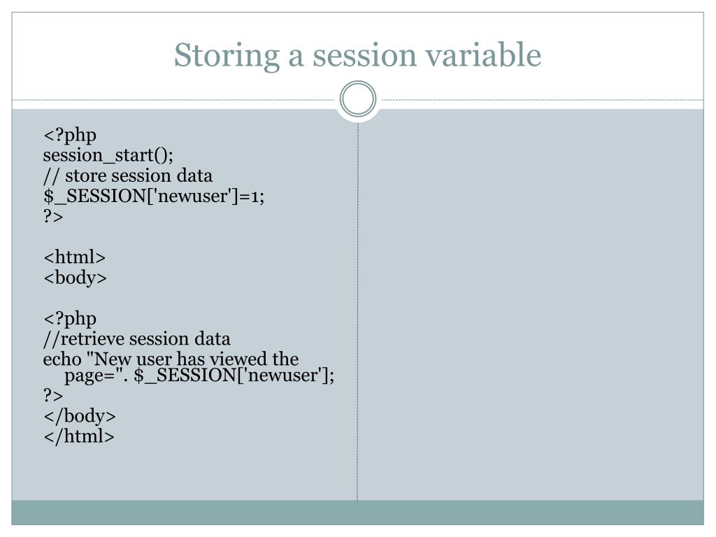 Storing a session variable <?php session_start(); // store session data $_SESSION['newuser']=1; ?> <html> <body> <?php //retrieve session data echo "New user has viewed the page=". $_SESSION['newuser']; ?> </body> </html>