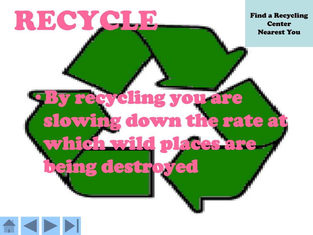 By recycling you are slowing down the rate at which wild places are being destroyed Find a Recycling Center Nearest You RECYCLE